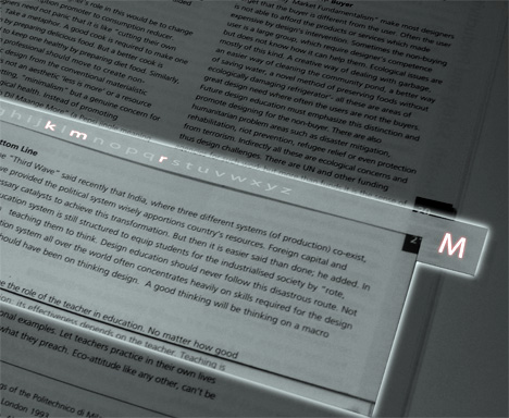 它采用软塑料制成,通过内置的FOLED(flexible organic light emitting diodes,柔性有机发光二极管)来提供光源,只需要将它覆盖在书页上就可以照亮并在黑暗中阅读书籍,还可以自由调节亮度。