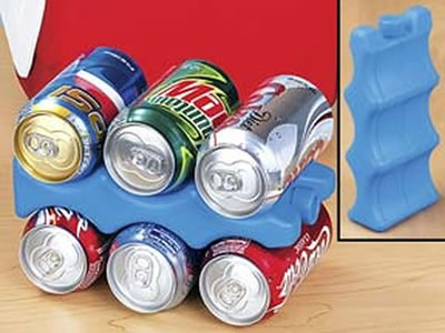 这其实是一款冷却架,在里面灌入水或者其他的液体,放到冰箱内冷冻之后,像图中那样把易拉罐放到这个小架子上就可以对饮料进行冷却了,每次可冷却6瓶。