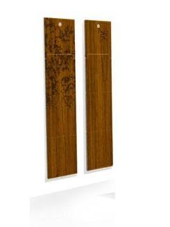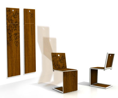 这两块木板其实是挂在墙上的两把椅子,图中的三个缝隙是椅子的弯折部位,通过特殊的支撑设计,就可以折成这样一把椅子了。由于配备了花纹,不用的时候就挂在墙上做为装饰品。
