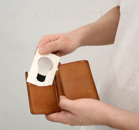 卡片灯(Pocket Light)是一项令人赞叹的创意,和普通信用卡一样轻薄,把灯泡折叠后还可以放到钱包里,只需要一块小小电池,在关键时刻就可以为你带来光明。