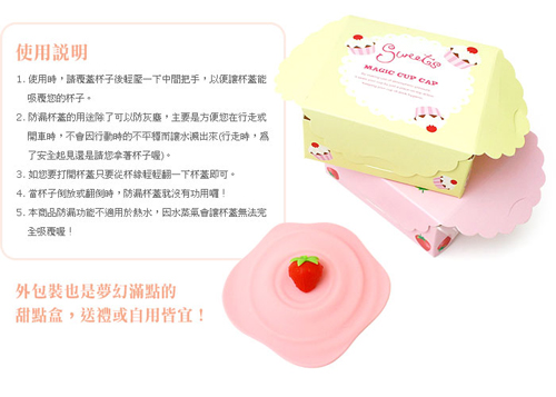 神奇杯盖又推出水果及甜点系列啦。香浓的蛋糕加上可爱的樱桃,这味道可是非一般的感觉。造型栩栩如生自然令人垂涎三尺......具有防水、防漏且防尘保温之功用,让你喝得又健康又安全。即使是外包装,也这样如花似玉,送人自用皆宜。