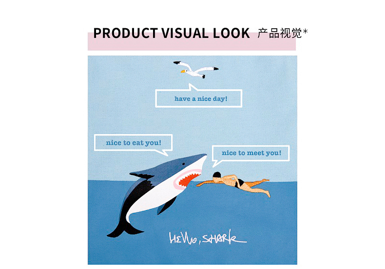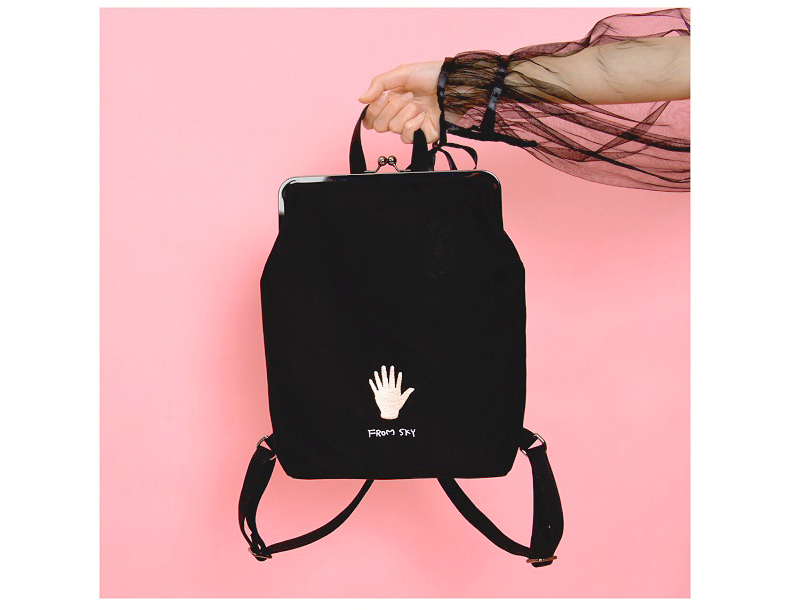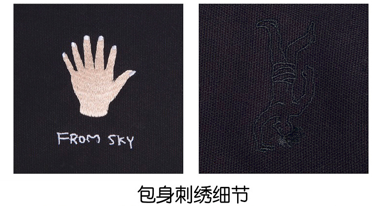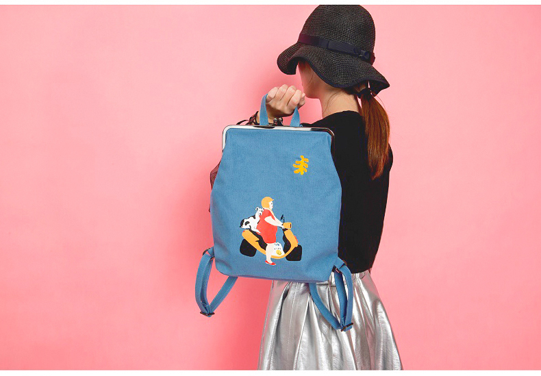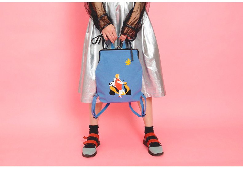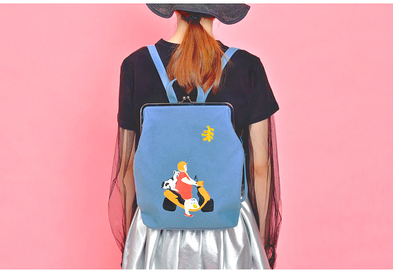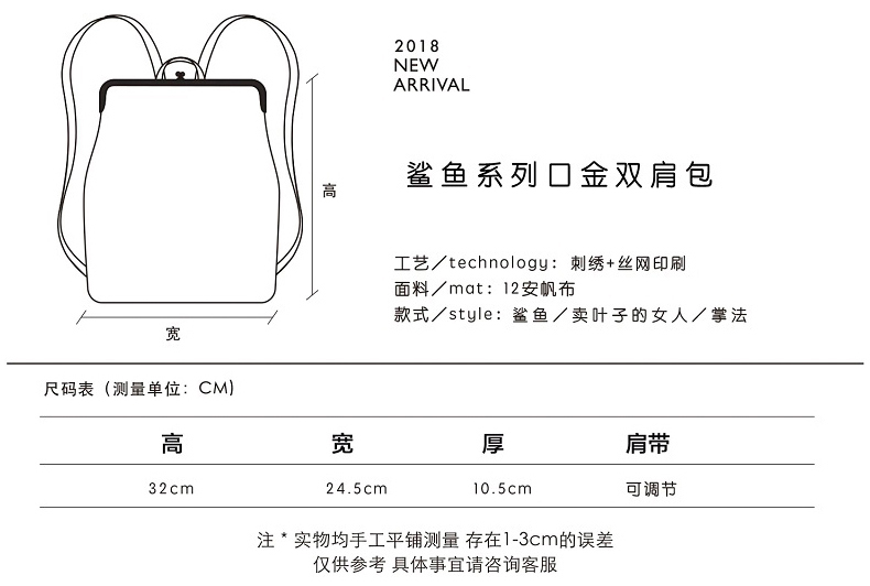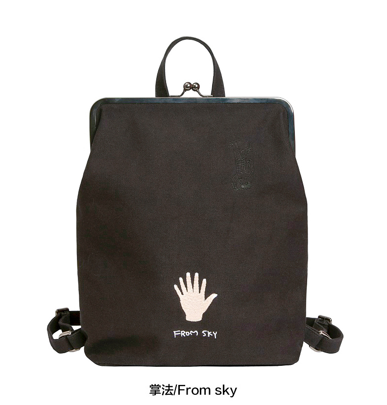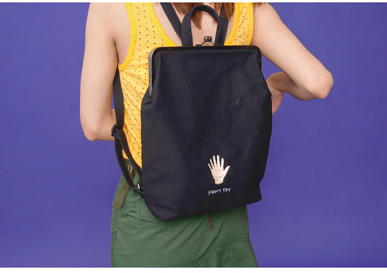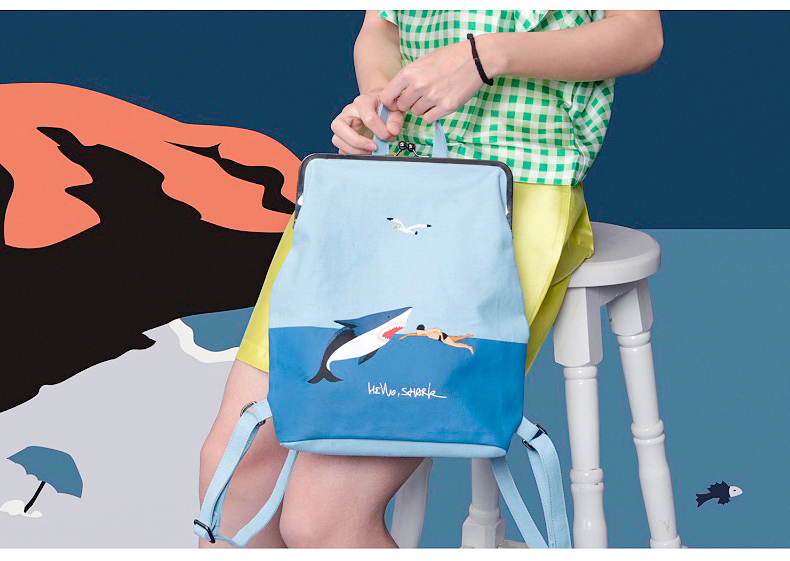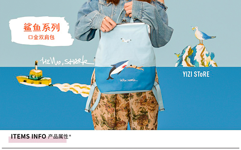 YIZI鲨鱼系列帆布刺绣口金双肩包-鲨鱼/手掌/摩托女人