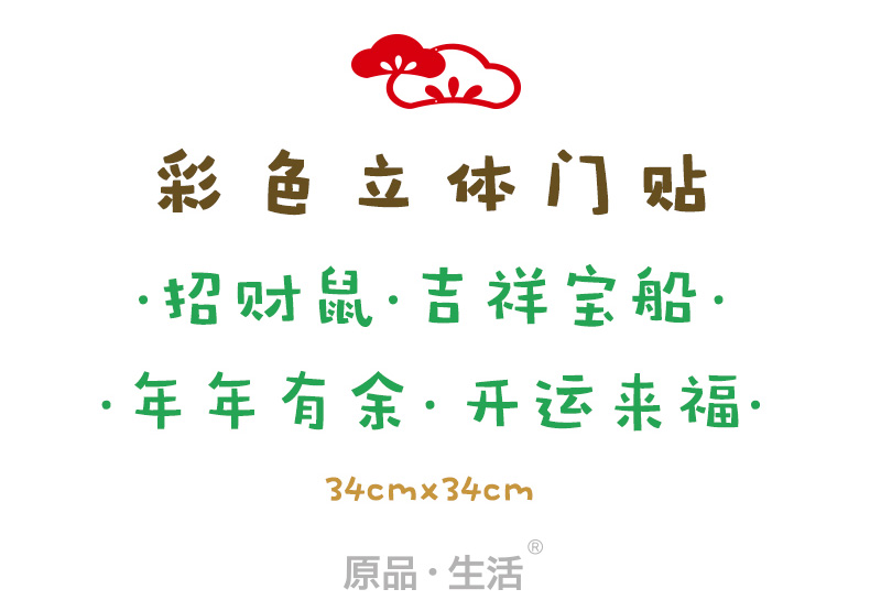 原品鼠年彩色立体方形门贴-招财鼠/吉祥宝船/年年有余/开运来福