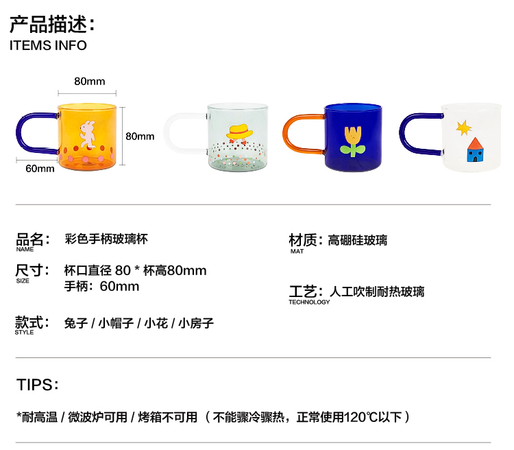 YIZI彩色手柄灯工玻璃杯-小花/兔子/房子/帽子