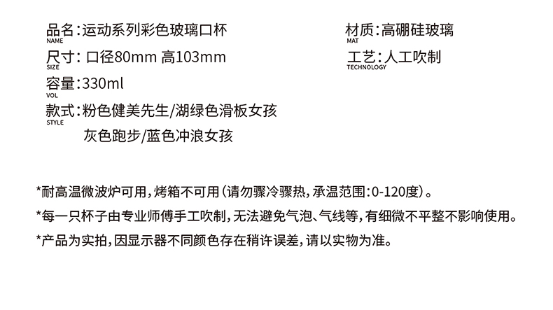 YIZISTORE运动系列耐高温彩色玻璃杯-跑步/滑板/冲浪/健美先生
