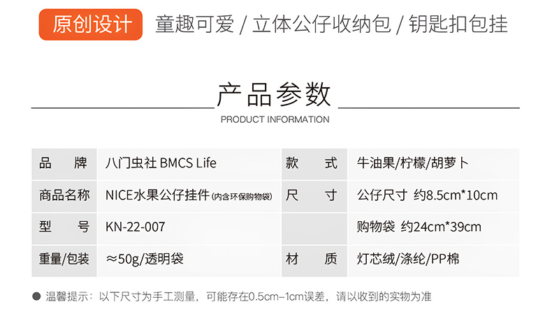八门虫社水果布艺公仔收纳多用挂件-牛油果/柠檬/胡萝卜