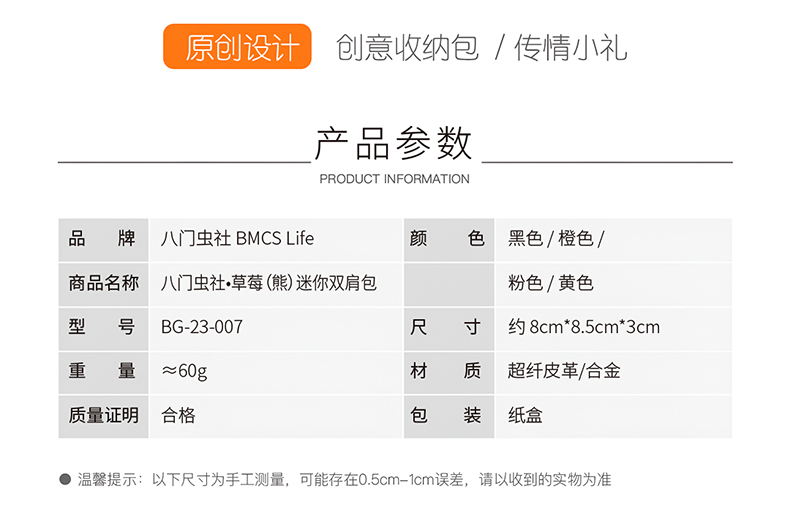 八门虫社草莓(熊)mini双肩收纳包-粉色/黄色/橙色/黑色