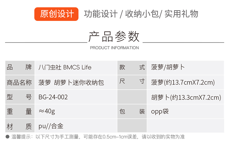 八门虫社水果收纳包零钱包钥匙包-菠萝/胡萝卜