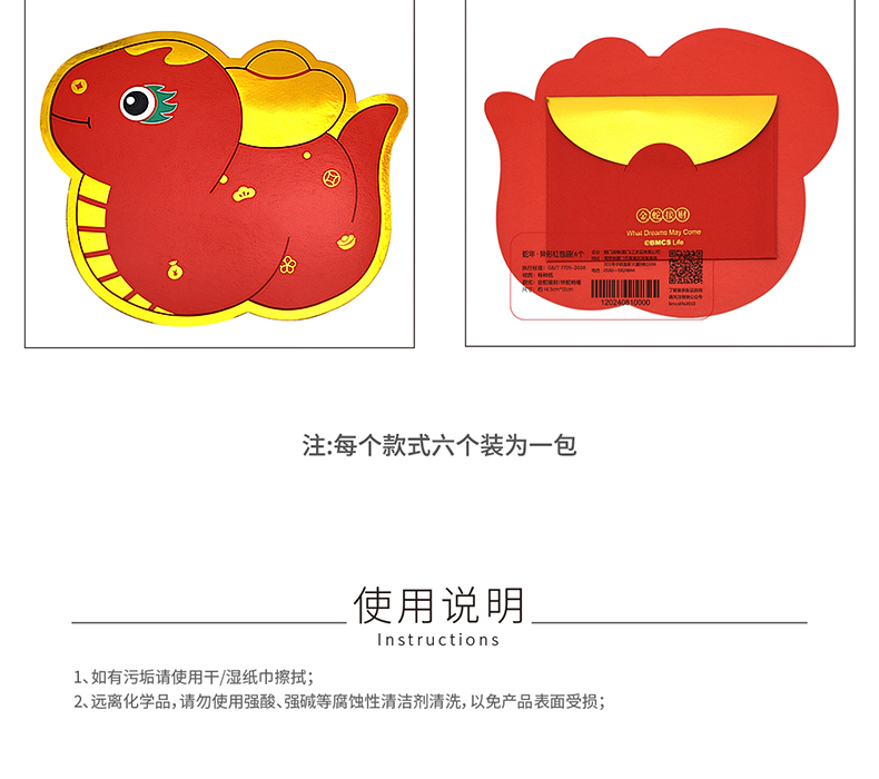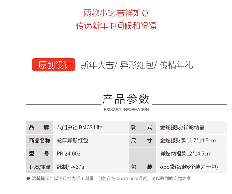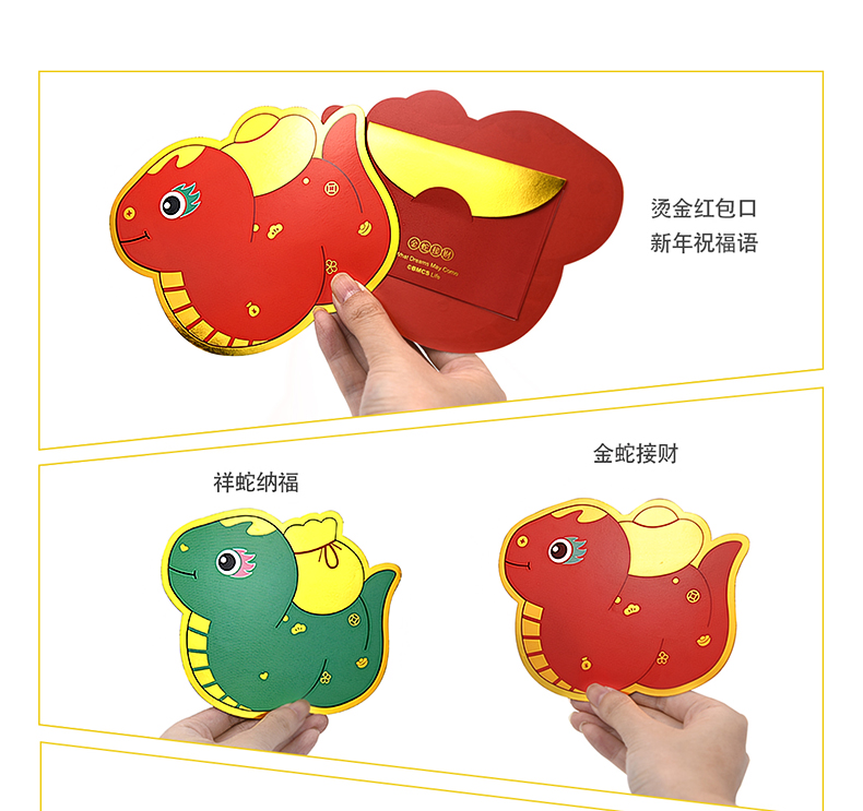 八门虫社蛇年造型彩印烫金红包(6枚入)-红色金蛇接财/绿色祥蛇纳福