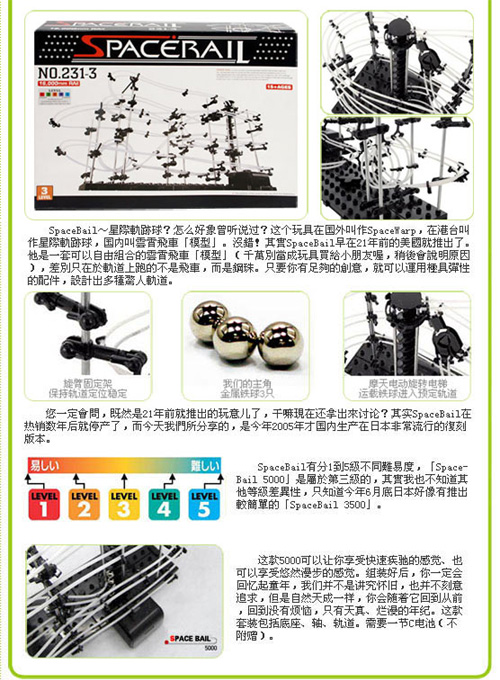 关于 SpaceRarp... “扭曲的空间”是一种模型,玩家可以自由组合,使一个钢珠可以通过架设好的轨道无限的循环旋转,让玩家充分体验空间扭曲的美妙和运动的快感。早在1984年,美国就推出了,热销数年后就停产了。彼时在中国大陆可能也要非常有钱的人家(同时也要很新潮)才能弄得到吧(想想当时中国还是处在物资匮乏的年代啊)?总计销售出了一百万台。偶然看到了台湾一个论坛里大家追忆SpaceRarp才知道当年在台湾也几乎大大小小的男孩子家里都曾经买过~~~有的还在上小学……让我很是羡慕啊! SpaceRarp是一种极富魅力的模型建筑(我觉得它更充满了建筑的美感更倾向于叫它作“建筑”),是让拥有它的人想要通过它炫耀自己的才思的一种变化无穷的玩具(你可以扔掉说明书的标准造型,完全依照自己对空间的理解来组装)。一时间红极一时。然后突然消失匿迹了(原因未知)。 2005年由日本Bandai公司推出的克隆版本(为何事隔那么久才重新推出,可能是在等版权失效吧),重新将这一令人深陷其中不能自拔的模型建筑带回到我们身边。 “空扭”总分1到5級不同难易度,目前知道的有「SpaceWarp start」、「SpaceWarp 3500」、「SpaceWarp 5000」、「SpaceWarp 10000」四种产品。