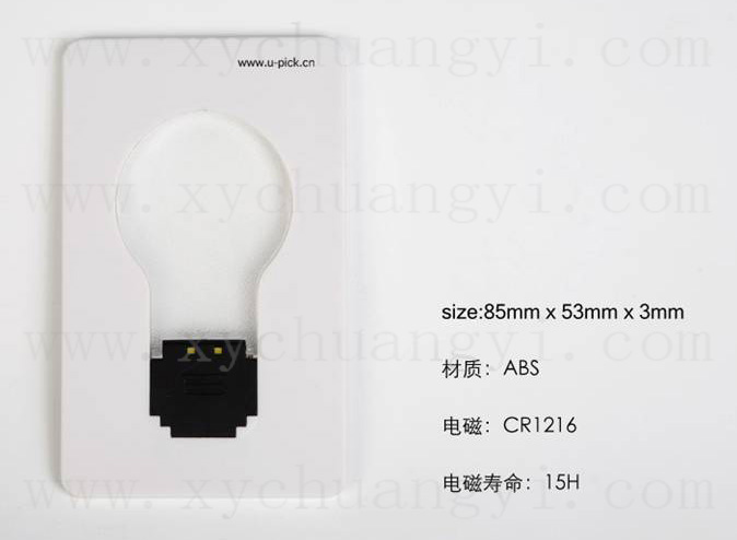 这么小的一张卡片居然可以用作照明,这张卡片中间镂出的灯泡形状可以向上翻折起来,然后底部的LED会发光,相反合并的话就会自动关闭。这样一盏小台灯就可以站立在桌子上了.此款小夜灯和银行卡大小一样,超薄、超轻、方便携带。就像放银行卡一样放钱包里即可,晚上照明也较方便取放。