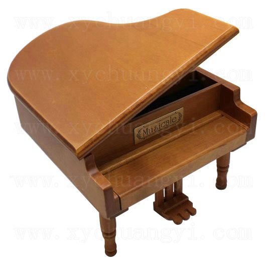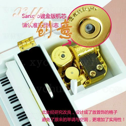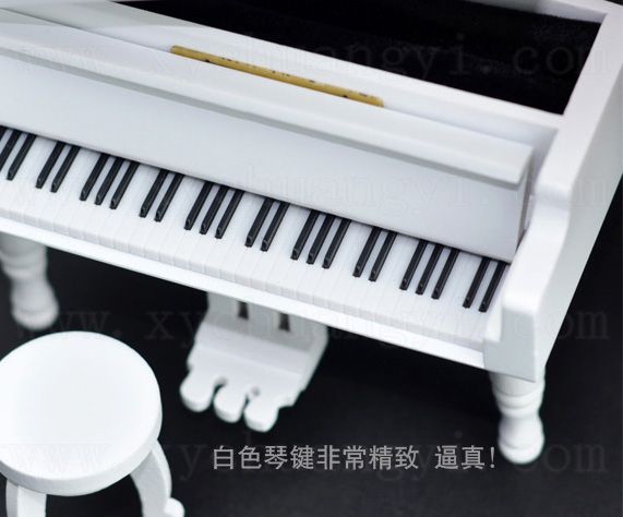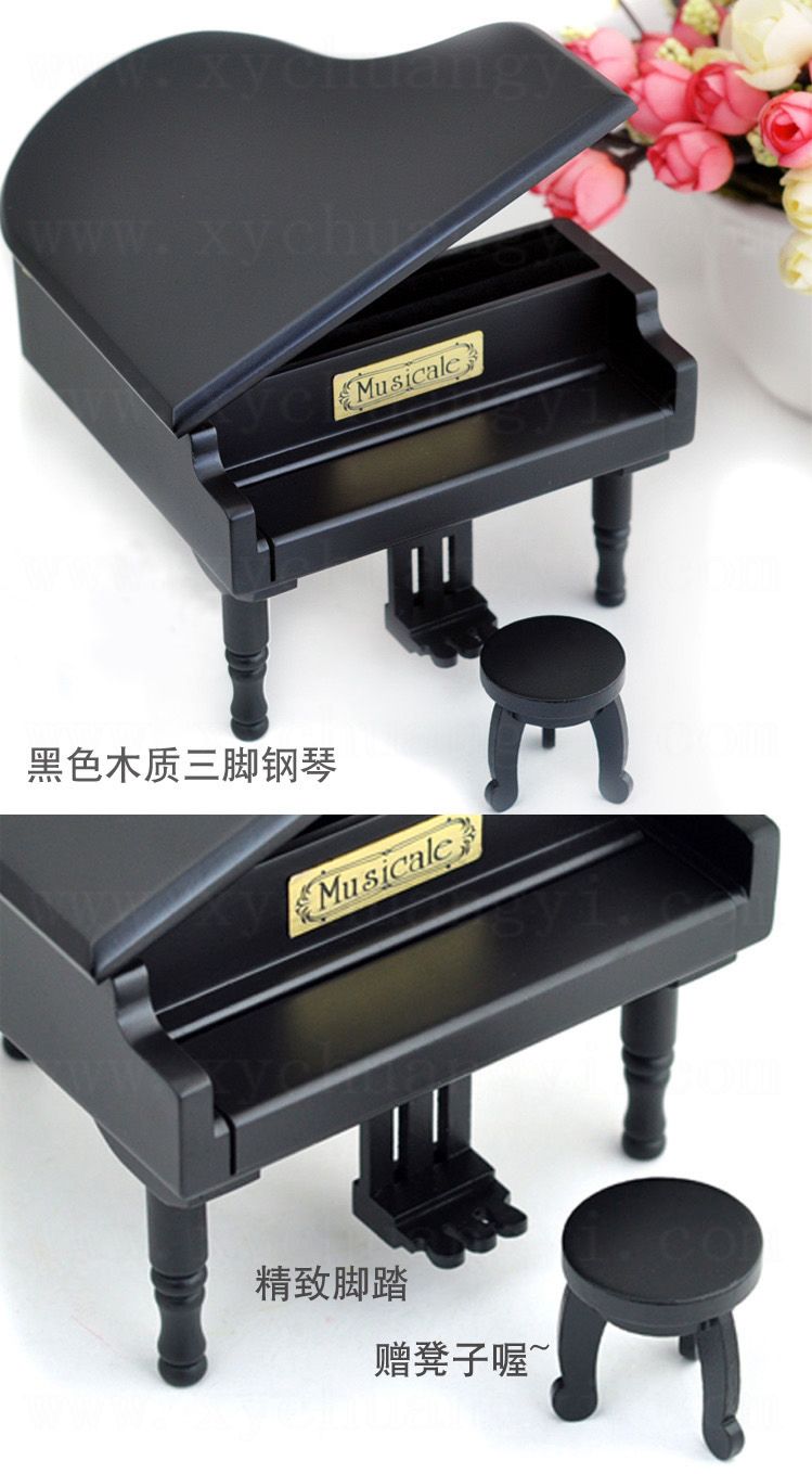 钢琴盖可以打开,打开顶部钢琴盖后要将音乐铃上方的小木条拉起来支住琴盖.如果小木条未拉起来,音乐不会响哦.它也是音乐铃的停止器. 内部有一个小格子里面可以收藏小宝贝哦,可以当首饰盒. 放在书桌上也可以放一些重要的小物件. 附一张可爱的小凳子.