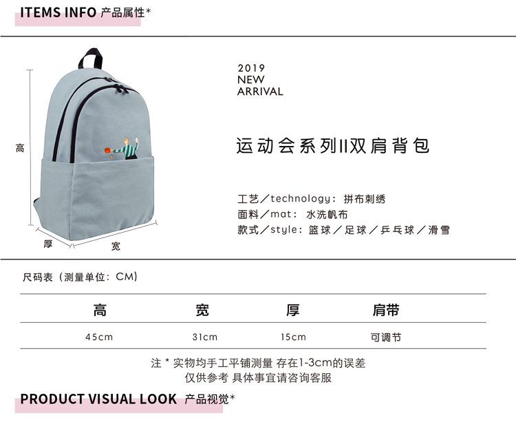 YIZISTORE运动会系列2刺绣帆布双肩包-篮球/滑雪/足球/乒乓球